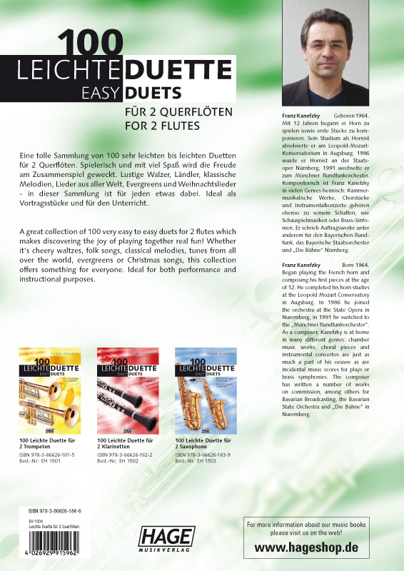 Eine tolle Sammlung von 100 sehr leichten bis leichten Duetten für 2 Querflöten. Spielerisch und mit viel Spaß wird die Freude am Zusammenspiel geweckt. Lustige Walzer, Ländler, klassische Melodien, Lieder aus aller Welt, Evergreens und Weihnachtslieder - in dieser Sammlung ist für jeden etwas dabei. Ideal als Vortragsstücke und für den Unterricht.