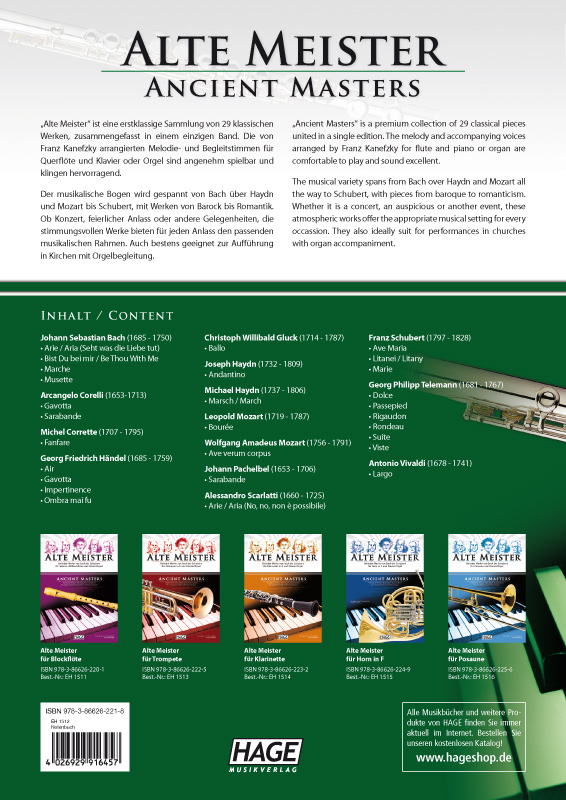 "Alte Meister" ist eine erstklassige Sammlung von 29 klassischen Werken, zusammengefasst in einem einzigen Band. Die von Franz Kanefzky arrangierten Melodie- und Begleitstimmen für Querflöte und Klavier oder Orgel sind angenehm spielbar und klingen hervorragend.