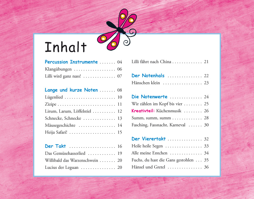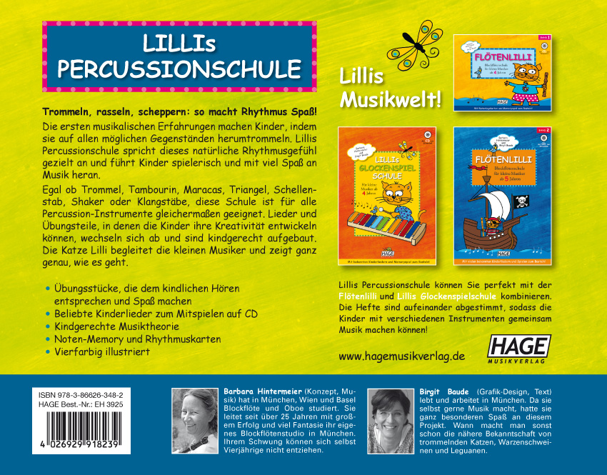 Trommeln, rasseln, scheppern: so macht Rhythmus Spaß! Die ersten musikalischen Erfahrungen machen Kinder, indem sie auf allen möglichen Gegenständen herumtrommeln. Lillis Percussionschule spricht dieses natürliche Rhythmusgefühl gezielt an und führt Kinder spielerisch und mit viel Spaß an Musik heran. Egal ob Trommel, Tambourin, Maracas, Triangel, Schellen-stab, Shaker oder Klangstäbe, diese Schule ist für alle Percussion-Instrumente gleichermaßen geeignet. Lieder und Übungsteile, in denen die Kinder ihre Kreativität entwickeln können, wechseln sich ab und sind kindgerecht aufgebaut. Die Katze Lilli begleitet die kleinen Musiker und zeigt ganz genau, wie es geht.