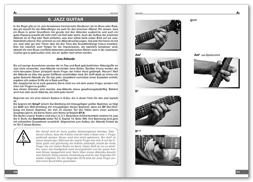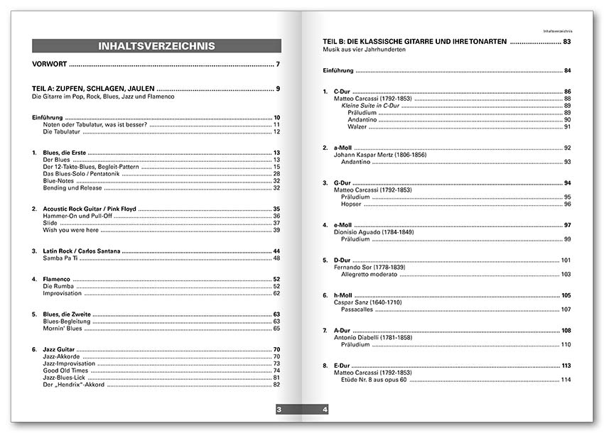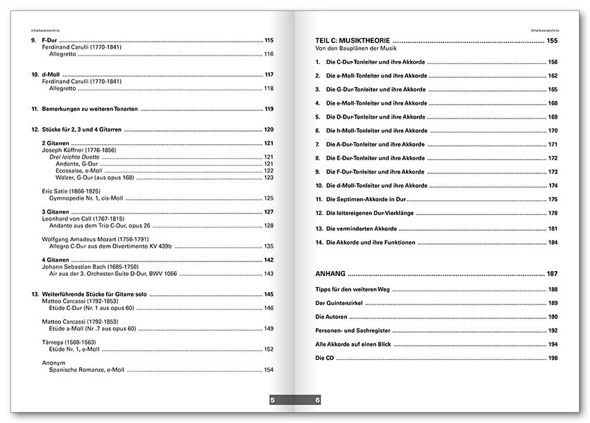 Hier kann der Gitarrist sich auf seinen ganz persönlichen Weg hin zu solidem und gutem Gitarrenspiel machen. Wer eher zur klassischen Gitarre neigt, wird sich vornehmlich mit Teil B des Buches beschäftigen; wessen Herz hingegen im Rock’n’Roll-Takt schlägt, der wird in Teil A fündig werden. Teil C widmet sich der Musiklehre und auch der Musiktheorie, denn Kenntnisse auch auf diesem Gebiet gehören zum soliden und guten Gitarrenspiel dazu. Die Autoren haben Wert darauf gelegt, den Lernenden mit möglichst vielen Stilen der Gitarre bekannt zu machen. Die beiliegende CD lässt sich auf vielfältige Weise beim Spielen und Üben nutzen.
