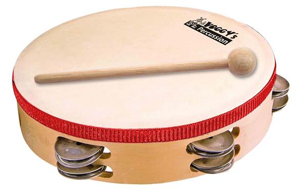 Strapazierfähiges und hygienisches Kunststoff-Fell; Tamburin aus Naturholz mit praktischem Griffloch und angefaster Fellauflage für einen klaren und kräftigen Ton.