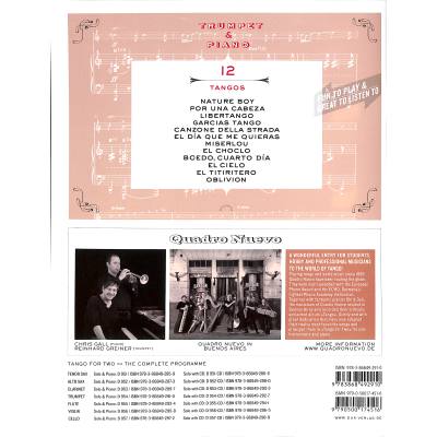 TANGO – das ist das Album des World Music Ensembles Quadro Nuevo, das nach einer „Buenos-Aires-Expedition“ zusammen mit dem Pianisten Chris Gall veröffentlicht wurde. TANGO FOR TWO – das ist die daraus entstandene Sammlung von 12 Tangos für die spannende „Duo-Besetzung“. Neben Eigenkompositionen wurden unter anderem Stücke von Ángel Villoldo (El Choclo), Carlos Gardel (Por una cabeza, El día que me quieras) und Astor Piazzolla (Libertango, Oblivion) für das Duospiel arrangiert. Die Reihe ist erhältlich für Tenorsaxophon, Altsaxophon, Klarinette, Trompete, Flöte, Violine und Violoncello, wahlweise in der Besetzung Solo + Piano oder Solo mit CD. Die CD beinhaltet alle 12 Titel als Play-along- und Duo-Versionen. Die Arrangements von Mulo Francel und Chris Gall liegen im mittleren Schwierigkeitsgrad.