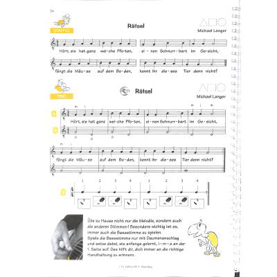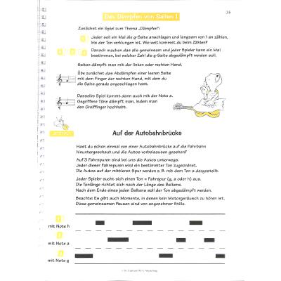 In kleinen überschaubaren Einheiten werden die Töne der C-Dur-Tonleiter in der 1. Lage erlernt. Diese Lernschritte sind in gleichbleibende Bausteine verpackt, die ein Musizieren mit und ohne Noten (Improvisation) ermöglichen. Mit Mitteln der Popularmusik (Guitar-Percussion, Ghost-Notes, Strumming etc.) wird von Anfang an auf rhythmisch allereinfachster Basis ein Zusammenspielen von mindestens drei Gitarrist/-innen ermöglicht.