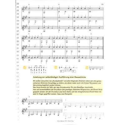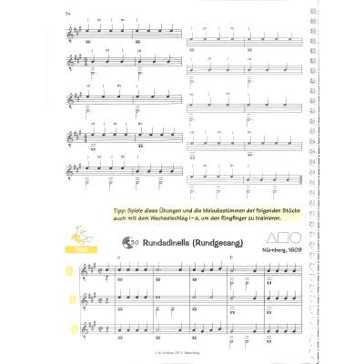 Nach einer ausführlichen Erklärung der Töne mit Versetzungszeichen ist der Band 2 mit Hilfe der Gruppenunterrichtssituation auch ein Lehrgang für zweistimmiges Spiel und ein Kurs für Tirando-Liedbegleitung mit einfachsten Akkorden. Beide Themengruppen sind ineinander verzahnt und dabei progressiv aufgebaut. Die Beherrschung des polyphonen Spiels in der Zweistimmigkeit von Melodie und Bass bzw. das Erlernen einfachster Zerlegungsmuster und Akkordwechsel ermöglichen den Einstieg in die Sololiteratur.
