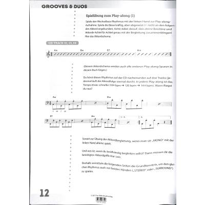 Alle Grooves, die der Schüler lernt, werden in einer einheitlichen Darstellung erklärt: es gibt ein Notenbild im Zusammenspiel von Bass (linke Hand) und Akkord (rechte Hand), darüber ist eine Zählleiste mit Pfeilen (= Akkord) und symbolisierte Note (= Einzelton) notiert. Dieses System kann auf das Klavier übertragen werden, eine zusätzliche Hilfe um sich mit der Harmonie vertraut zu machen. Deshalb sind auf der CD auch die Übungen zuerst im Zusammenspiel von Klavier- und Percussion-Sound eingespielt und danach erst auf dem Akkordeon. Damit möchte der Autor dem Spieler noch einmal bewusst machen, dass sich diese Begleitrhythmen früher eigentlich aus drei eigenständigen Instrumenten zusammensetzten.