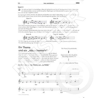 Der erste Band „Spiel Akkordeon“ ist in vier Kapitel unterteilt, die viele Übungsstücke enthalten, die fast alle auf der beigefügten CD (inkl. Play-alongs) eingespielt wurden. In Kapitel 1 werden die Grundlagen des Akkordeonspiels (Haltung des Instruments, Klangregister und noch mehr) vorgestellt und die Spieltechniken (Legato, Staccato, Dynamik) in einfachen ersten Spielstücken in C-Dur eingeübt. Von Kapitel 2 bis Kapitel 4 kommen immer mehr Tonarten hinzu, so dass der Schüler am Ende Spielstücke in Dur- und Molltonarten spielen kann. Wissenswertes über das Instrument (Klangregister, das Innenleben und die Geschichte eines Akkordeons) und Musikformen (jiddische Lieder, argentinischer Tango, Chanson, Musette) mit Seitenangaben zu den jeweiligen Stücken in jedem Kapitel runden den umfangreichen Lernstoff dieses ersten Bandes ab und ermöglichen jedem Schüler entweder mit dem Lehrer oder im Selbststudium sich das Akkordeonspielen anzueignen.