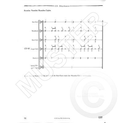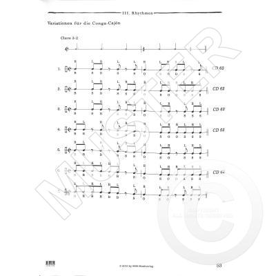 In Kapitel drei werden die traditionellen Pattern behandelt, unterteilt in brasilianisch, afrikanisch und kubanisch mit Rhythmen wie Sambafunk, Timbalada, Afro Beat, Siko, Rumba Yambú oder Agayu. Kapitel vier stellt die modernen Grooves mit Funk’n’Latin, dem Backbeat 4/4, dem HipHop- und Soul-Groove und den Pop und Rock Beats vor. Der Praxisteil endet mit Kapitel fünf, in dem Charly Böck vier Ensemblestücke zusammengetragen hat, damit der Schüler auch direkt das Spiel in der Gruppe lernt.