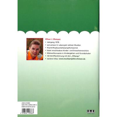 Oliver Ehmsen, aktiver Musiker (Pianist, Keyboard und Sänger) und ausgebildeter Grundschullehrer hat durch seine pädagogische Arbeit mit Kindern (z. B. in der musikalischen Früherziehung) zwei Hefte mit Kindermitmachliedern geschrieben. „Der grüne Frosch mit der roten Mütze“, der als Puppe mit dem Autor seine Auftritte in Kindergärten und Grundschulen gestaltet, wird zum Titelgeber des ersten Bandes. Im zweiten Band gibt es in „Ein Koffer voller Lieder“ (AMA-Nr. 610429) 25 neue Kinderlieder für das ganze Jahr.