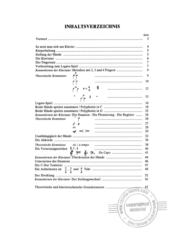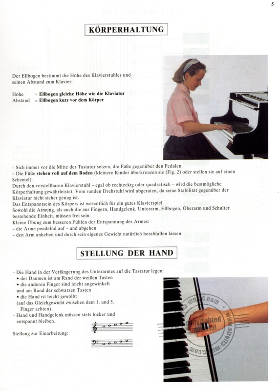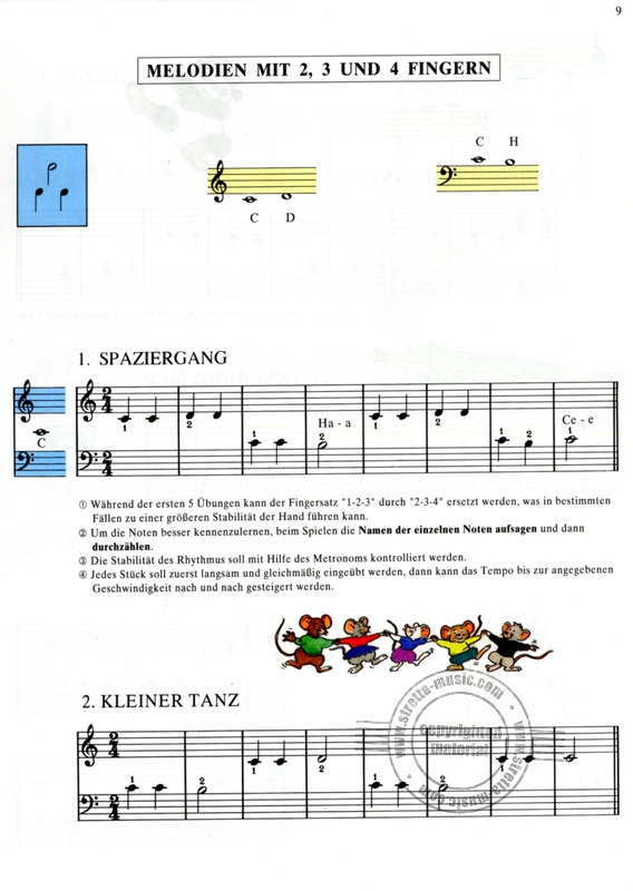 Alle Themen werden anhand von kleinen Stücken erarbeitet; das Buch ist liebevoll illustriert (auch ganze Seiten!) und zählt zu den Unterrichtsklassikern in Frankreich. Inhalt: Die richtige Körperhaltung & Stellung der Hände; Fingersatz; Legato; Melodien mit 2-4 Fingern zum Kennenlernen der Klaviatur; Basis-Rhythmik; Legato; Kombination links + rechts; Artikulation & Phrasierung; Akkorde; Vorzeichen; Überkreuzen der Hände & Untersetzen des Daumens; C-Dur-Tonleiter; Achtelnoten; der Dreiklang; mit einer Zusammenfassung & kleinem Übungsteil hinten im Heft.