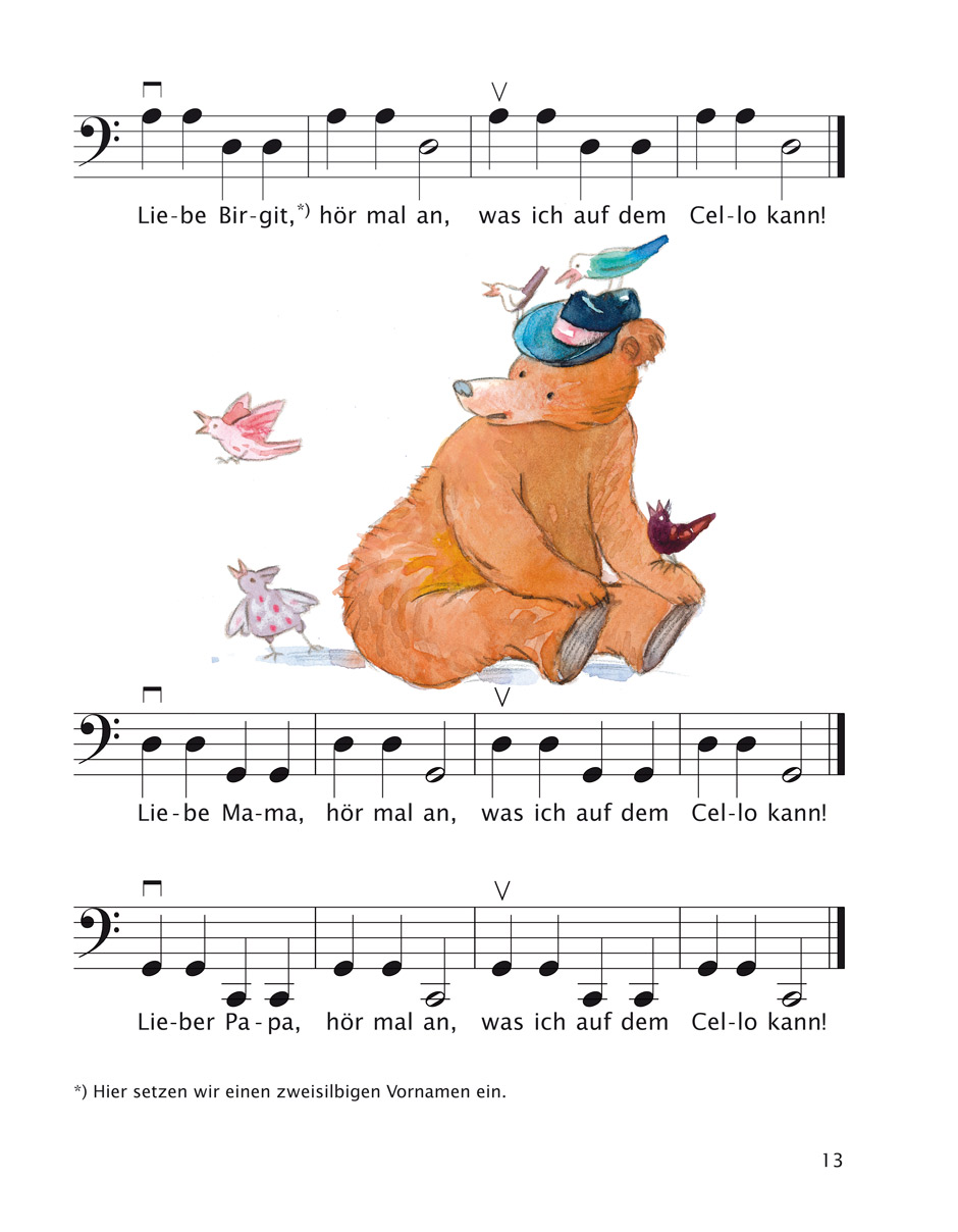 Nach dem Einstieg mit leeren Saiten und einfachsten Notenwerten folgt die „Rufterz“ als Basis- und Orientierungsintervall insbesondere im Hinblick auf das Erlernen einer sauberen Intonation. Anhand von Kinderliedern, die allesamt textiert sind, damit die Melodielinien stets im Ganzen aufzufassen sind, werden im ersten Heft sukzessive der dritte, erste und vierte Griff-Finger sowie Vorzeichen und Notenwerte von der Ganzen bis zu Achteln eingeführt. Ein besonderes Augenmerk liegt von Beginn an auf dem Lesen der Notenschrift; darüber hinaus werden einfache Saitenübergänge und grundlegende Stricharten trainiert. Dem Heft, das mit vergrößertem Notenbild und zauberhaften farbigen Illustrationen besonders kindgerecht ausgestaltet ist, liegt ein Bogen mit Notenkärtchen zum Ausschneiden bei, anhand derer die kleinen Schüler zahlreiche Lege- und Ratespiele erfinden und später auch Tonleitern und Notennamen erlernen können.