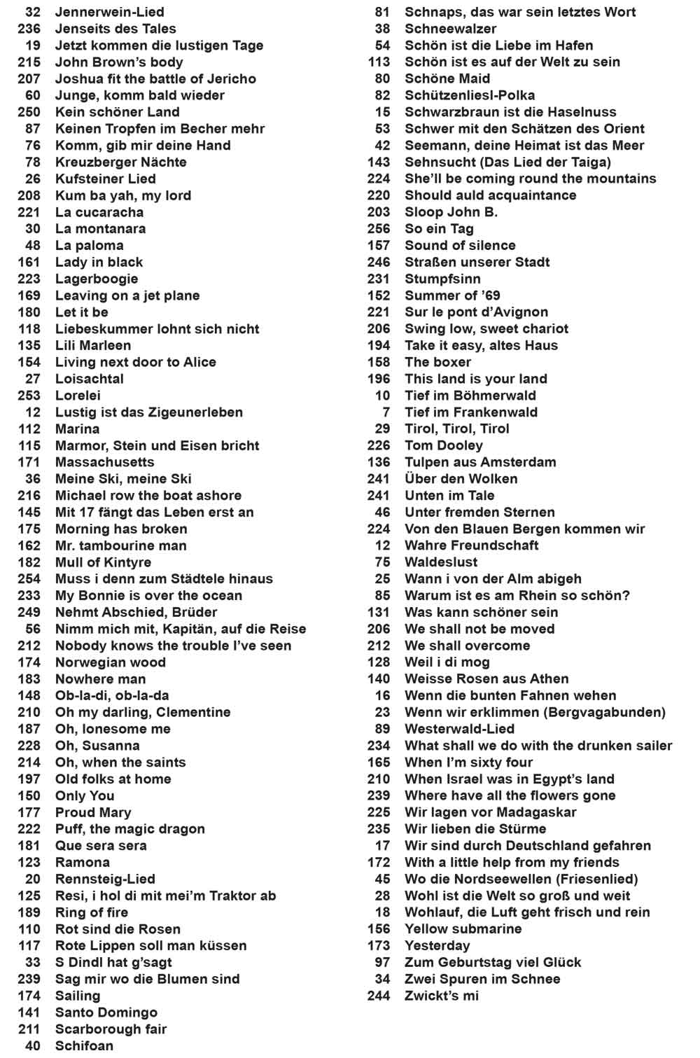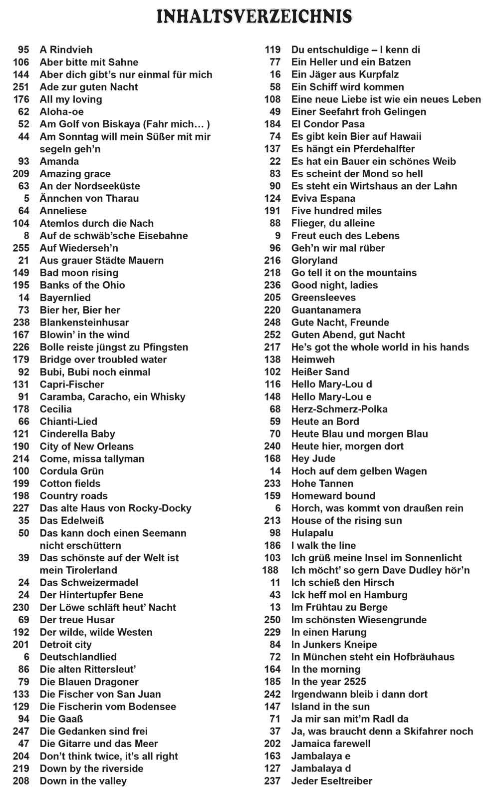 Jeder Song ist zweimal notiert – einmal mit Melodielinie, Text und Akkorden, einmal als Text mit Akkorden. Tempo- und Rhythmus-Angaben sind ebenfalls enthalten. Die Handhabung wird durch eine benutzerfreundliche Spiralbindung vereinfacht und macht den Notenschatz zu einem bewährten Kompendium an Liedern zum Mitsingen mit Freunden und Familie.