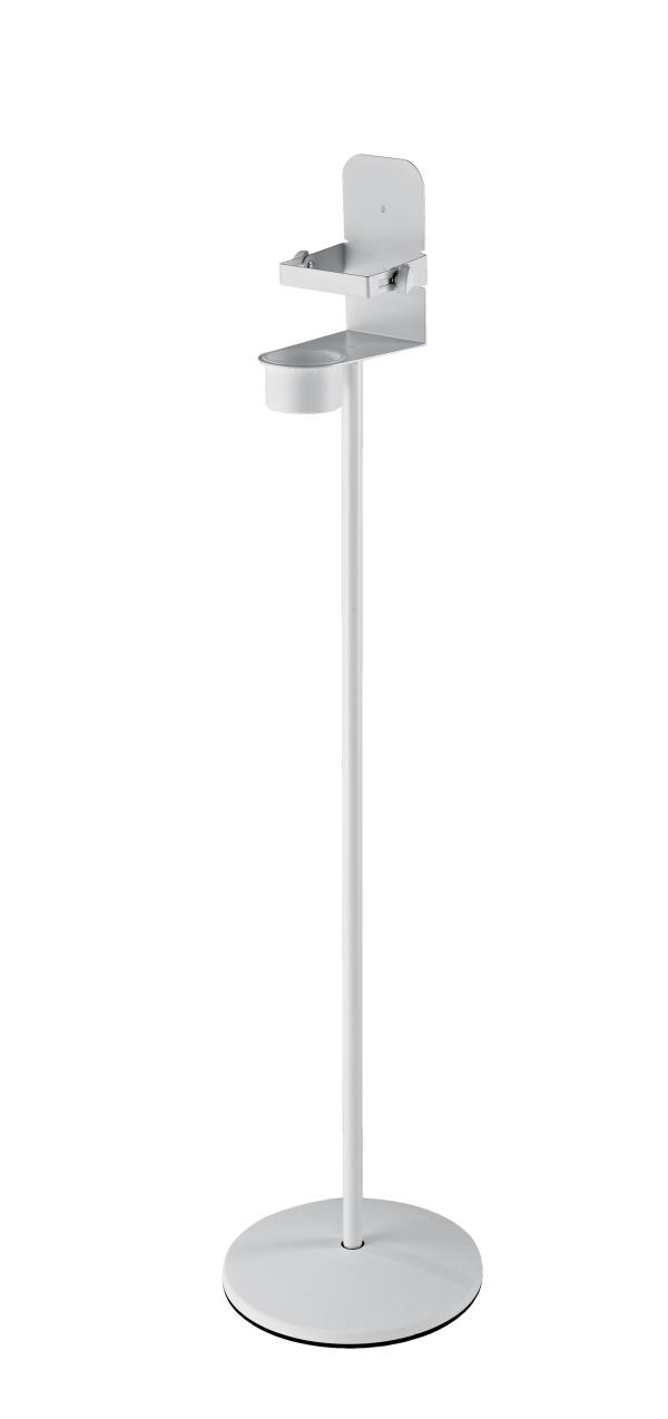 Rundsockel mit ø 275 mm und umlaufendem Bodenschutz aus Gummi. Stahlrohr weiß pulverbeschichtet. Höhe 1.020 mm. Abmessungen Flaschenhalter Innen 102 x 65 bis 102 mm. Mit Klemmbügel zum Fixieren der Desinfektionsflasche. Die Kunststoff-Tropfschale kann zur Reinigung entnommen werden. Bitte beachten Sie, dass es sich bei dem Stativ um kein medizinisch zertifiziertes Produkt handelt. Desinfektionsmittel nicht im Lieferumfang enthalten.