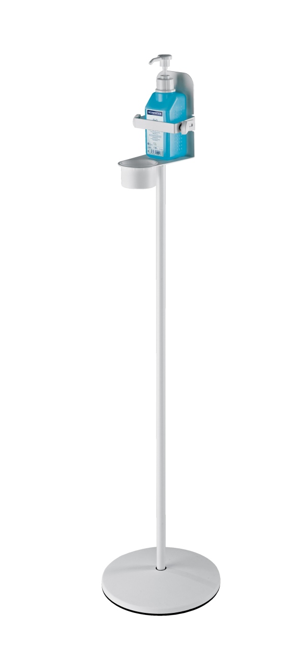 Rundsockel mit ø 275 mm und umlaufendem Bodenschutz aus Gummi. Stahlrohr weiß pulverbeschichtet. Höhe 1.020 mm. Abmessungen Flaschenhalter Innen 120 x 65 bis 102 mm. Mit Klemmbügel zum Fixieren der Desinfektionsflasche. Die Kunststoff-Tropfschale kann zur Reinigung entnommen werden. Bitte beachten Sie, dass es sich bei dem Stativ um kein medizinisch zertifiziertes Produkt handelt. Desinfektionsmittel nicht im Lieferumfang enthalten.