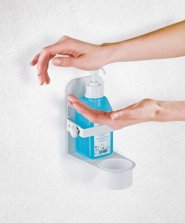 Tropfschale kann zur Reinigung entnommen werden; mit Klemmbügel zum Fixieren der Desinfektionsflasche |