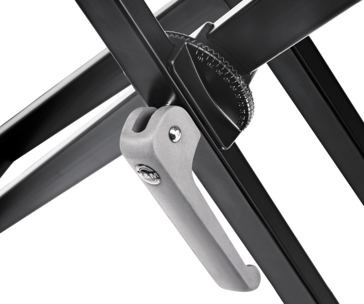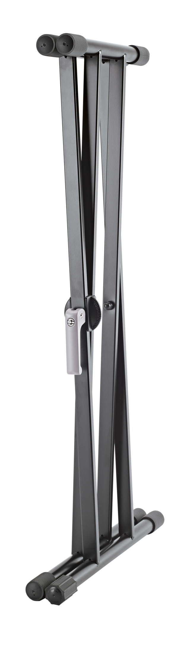 Extrem leicht und trotzdem äußerst stabil ist dieser X-Ständer aus Aluminiumrohren. Die Anordnung der doppelstrebigen Standrohre sorgt für spürbar mehr Stabilität und Sicherheit. Der ergonomische Klemmhebel ermöglicht ein schnelles und einfaches Aufstellen bzw. Zusammenklappen im Handumdrehen. Das robuste Metallgelenk ist mit 5° Schritten sehr fein verzahnt und ermöglicht so eine Vielzahl von verschiedenen Positionierungen. Anhand einer Skala kann man seine bevorzugte Aufstellvariante schnell wiederfinden. Die beiden hinteren Gummiauflagen sind axial verschiebbar und können somit perfekt an die Breite des Keyboards angepasst werden. Die max. Auflagentiefe beträgt 350 mm. Die K&M-typischen Qualitätsmerkmale wie solide Verarbeitung, hochwertige Oberflächenbeschichtung und ein praktischer Ausgleichsparkettschoner für Bodenunebenheiten runden das Gesamtkonzept ab. Mit dem Aufsatz 18941 ist dieser Ständer für ein zweites Keyboard erweiterbar.