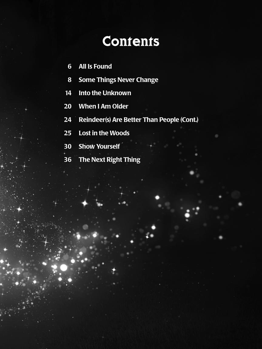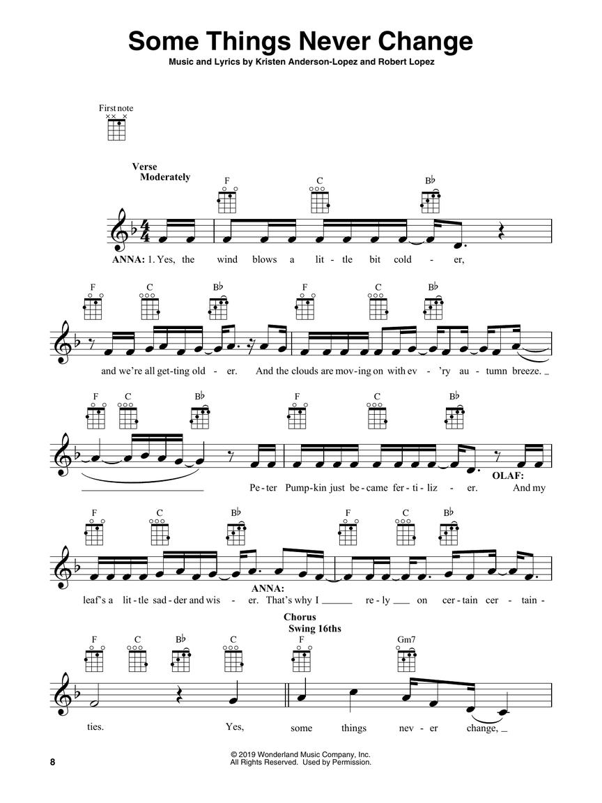 This songbook features eight songs from Disney's latest blockbuster arranged with melody, lyrics, and chord diagrams for standard G-C-E-A tuning. Songs include: All Is Found • Into the Unknown • Lost in the Woods • The Next Right Thing • Reindeer(s) Are Better Than People (Cont.) • Show Yourself • Some Things Never Change • When I Am Older. Also includes black and white photos from the motion picture!