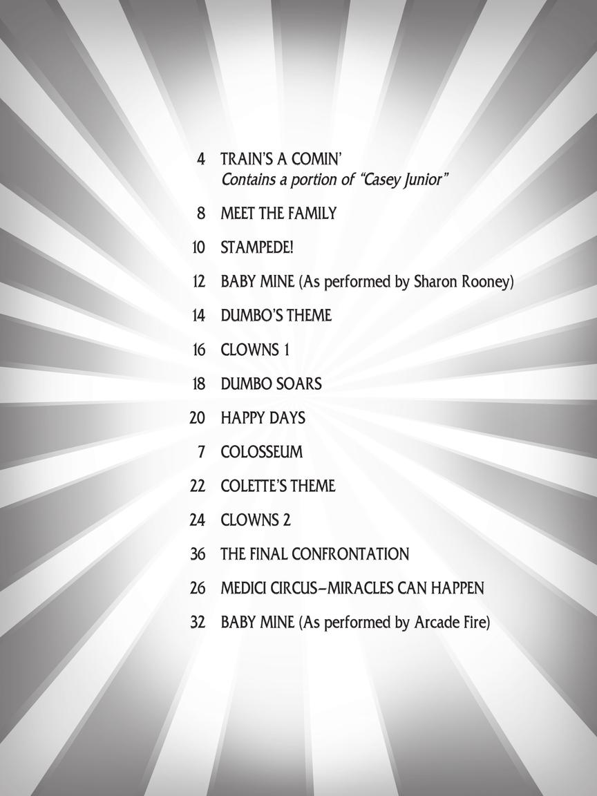 This folio features 13 pieces from Danny Elfman's acclaimed score for the live action 2019 adaptation of Dumbo. Titles include: Baby Mine (both Sharon Rooney and Arcade Fire versions) • Clowns 1 • Clowns 2 • Colette's Theme • Colosseum • Dumbo Soars • Dumbo's Theme • The Final Confrontation • Happy Days • Medici Circus-Miracles Can Happen • Meet the Family • Stampede! • Train's a Comin'.
