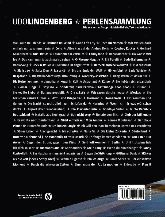Die als aufwendiges Hardcover gestaltete Perlensammlung zollt dem Panik-Rocker Udo Lindenberg gebührenden Tribut. Das Songbook umfasst auf mehr als 400 Seiten 100 Hits aus Lindenbergs breit gefächertem Werk, alle Schaffensperioden sind dabei abgedeckt. Neben den Liedern enthält das Buch viele zum Teil noch unveröffentlichte Fotos und umfangreiches Zusatzmaterial aus dem Udo Lindenberg Archiv in Berlin sowie ein exklusives Vorwort von Udo.