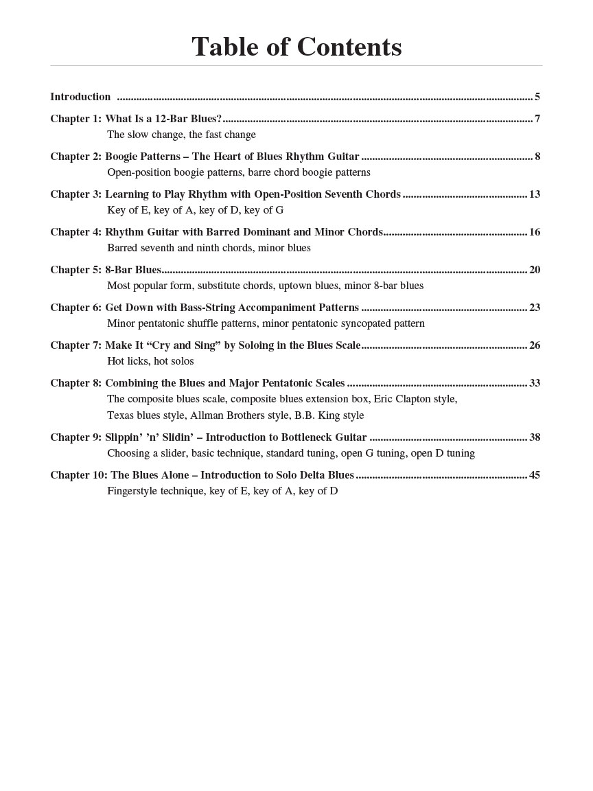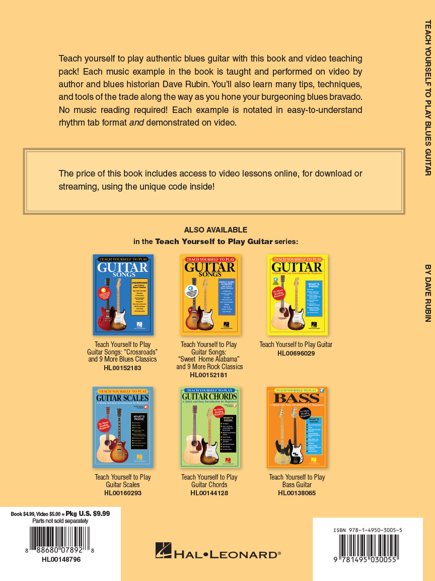 Teach yourself to play authentic blues guitar with this book and video teaching pack! Each music example in the book is taught and performed on video by author and blues historian Dave Rubin. You'll also learn many tips, techniques and tools of the trade along the way as you hone your burgeoning blues bravado. No music reading required! Each example is notated in easy-to-understand rhythm tab format and demonstrated on video. Topics covered include: 12 bar, 8-bar and minor blues • common chords and scales • boogie patterns and bass-string riffs • slide guitar • solo fingerstyle blues • and much more.