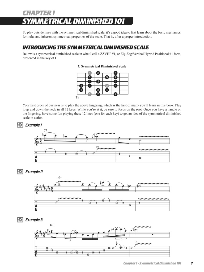 Take your improvisations “outside” with the amazing symmetrical diminished scale! Renowned guitarist and teacher Chris Buono takes you on a comprehensive exploration deep inside this versatile octatonic scale, providing loads of playing examples, fingering patterns, licks and detailed breakdowns to study and practice. In addition, Chris demonstrates every playing example in the book for you on the video which is provided online for download or streaming.