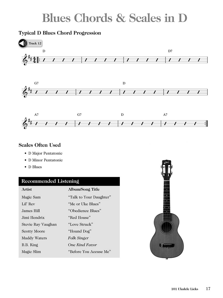 From blues to bluegrass, uke can play it all! In this one-of-a-kind book and audio pack, you get over a hundred authentic licks notated for the ukulele in standard notation and tablature. Plus there are tons of extras – common chord progressions, scales, uke history, recommended listening, information on uke builders, blogs, websites, and more! The accompanying audio is accessed through Hal Leonard's popular MyLibrary system using the provided code. The audio can be streamed or downloaded and includes PLAYBACK+, a multi-functional audio player that allows you to slow down audio without changing pitch, set loop points, change keys, and pan left or right.