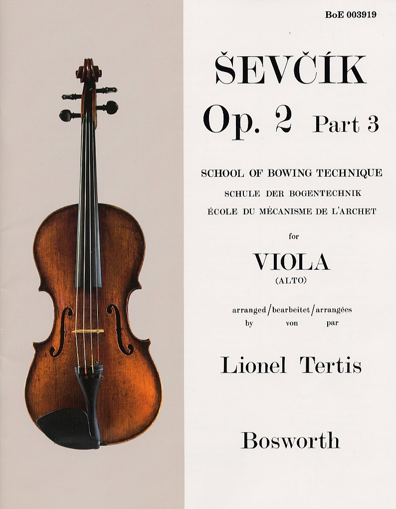 Von Otakar Sevcik. Bogenübungen, systematisch und nach Schwierigkeitsgrad aufsteigend geordnet. Von den ersten Anfängen bis zur Fertigkeit der rechten Hand. Für Viola arrangiert von Lionel Tertis. Text und Spielanweisungen auf Deutsch, Englisch und Französisch.