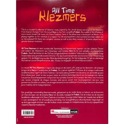 All Time Klezmers ist eine wundervolle Sammlung von Klezmermusik, inspiriert von den jüdischen Tänzen und Liedern der Klezmorim aus Osteuropa: vom lyrischen Hora bis hin zum schnellen, unwiderstehlichen Freilach. Einige Stücke haben eine optionale zweite Stimme für das Zusammenspiel oder eine Variation in einer Wiederholung. Für die Begleitung wurden Akkordsymbole hinzugefügt. Auf der beiliegenden CD gibt es vollständige Aufnahmen sowie Mitspielversionen aller Stücke, live eingespielt von echten Klezmermusikern.