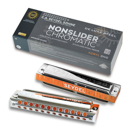 Die NONSLIDER Chromatic DE LUXE STEEL ist eine SEYDEL Projekt-Studie in limitierter Auflage, die dem Spieler viele neue Möglichkeiten eröffnet, voll chromatisch zu musizieren - egal ob dieser bisher Chromatische Mundharmonika gespielt hat oder auf der diatonischen Blues Harmonica unterwegs war!