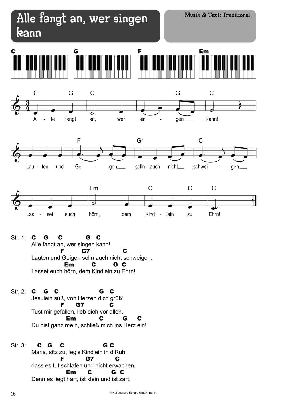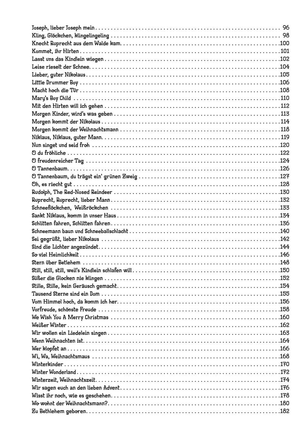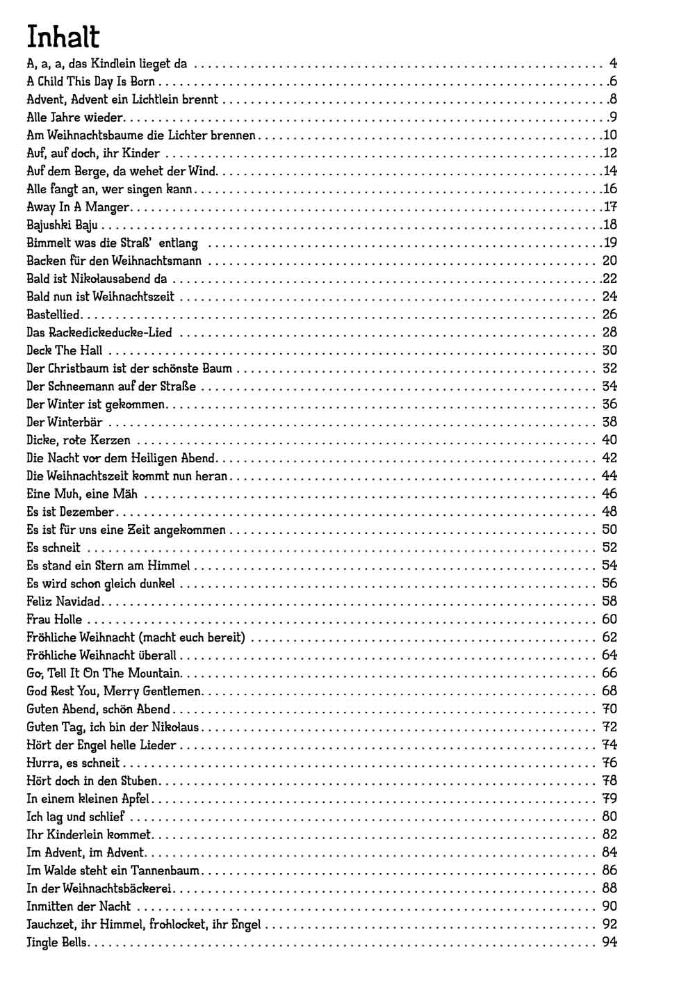 Traditionelle Weihnachtslieder für die ganze Familie, Weihnachtsklassiker von Rolf Zuckowski, Detlev Jöcker oder Frederic Vahle sind ebenso vertreten wie Popsongs wie Mary’s Boy Child von Boney M. oder Hurra, es schneit von Nena. Auch mit dabei sind viele beliebte Lieder aus der ehemaligen DDR, wie z.B. Oh, es riecht gut, Vorfreude, schönste Freude oder Tausend Sterne sind ein Dom. Die Sammlung eignet sich wunderbar für den Kindergarten, die Grundschule oder für das gemeinsame Singen und Musizieren zu Hause.