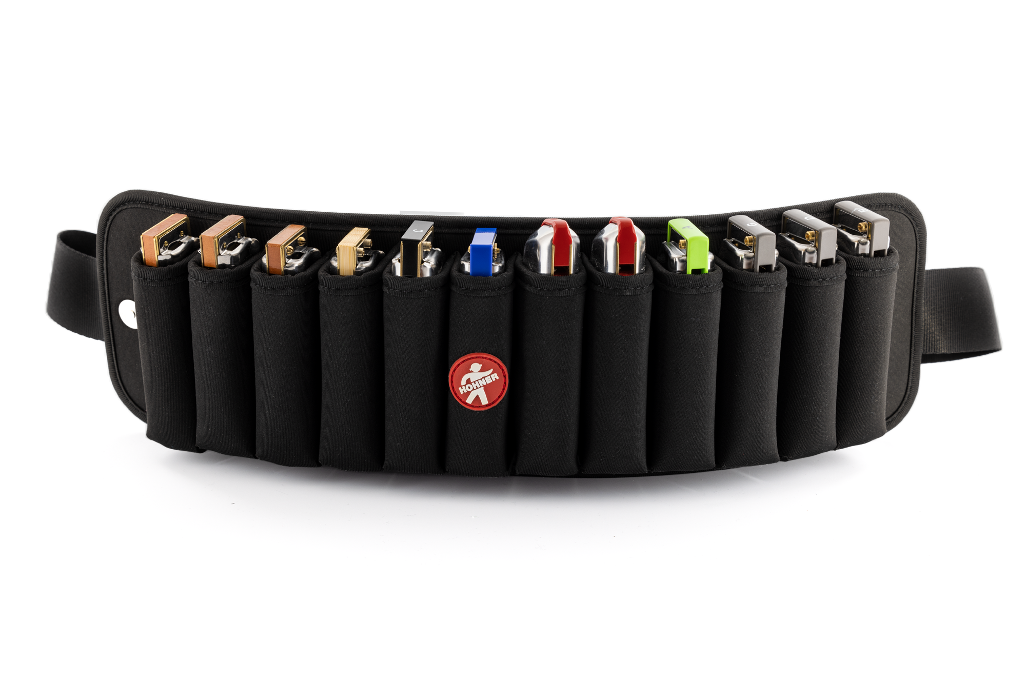 Der FlexBelt bietet Platz für bis zu 12 diatonische Mundharmonikas, lässt sich praktisch und bequem tragen.