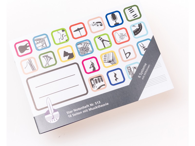 - 6 Systeme - DIN A 5, quer, - 16 Seiten mit Hilfslinien - Kleiner Überblick in die Musiklehre auf 3 Umschlagseiten